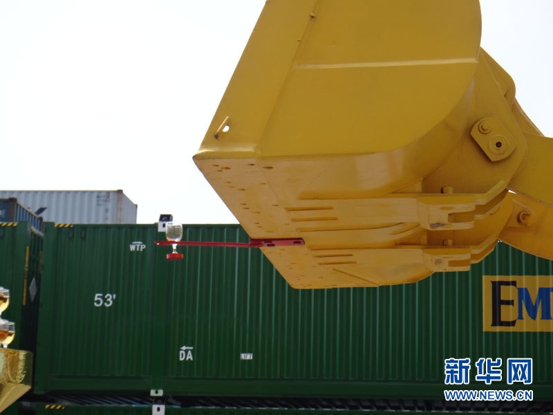 装载机的铲斗夹起一个空酒杯缓缓升起。