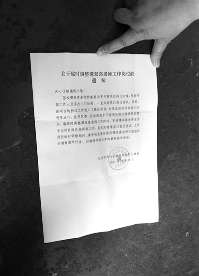 这份“关于临时调整谭双喜老师工作岗位的通知”称,“谭双喜老师的婆婆为枣子园项目拆迁对象,经指挥部工作人员多次上门协商,一直未能签订拆迁协议。按照区委区政府及枣子园项目拆迁指挥部的要求,请临时调整谭双喜老师的工作岗位,安排谭双喜老师至枣子园项目拆迁指挥部工作,直至其婆婆签订拆迁协议。”