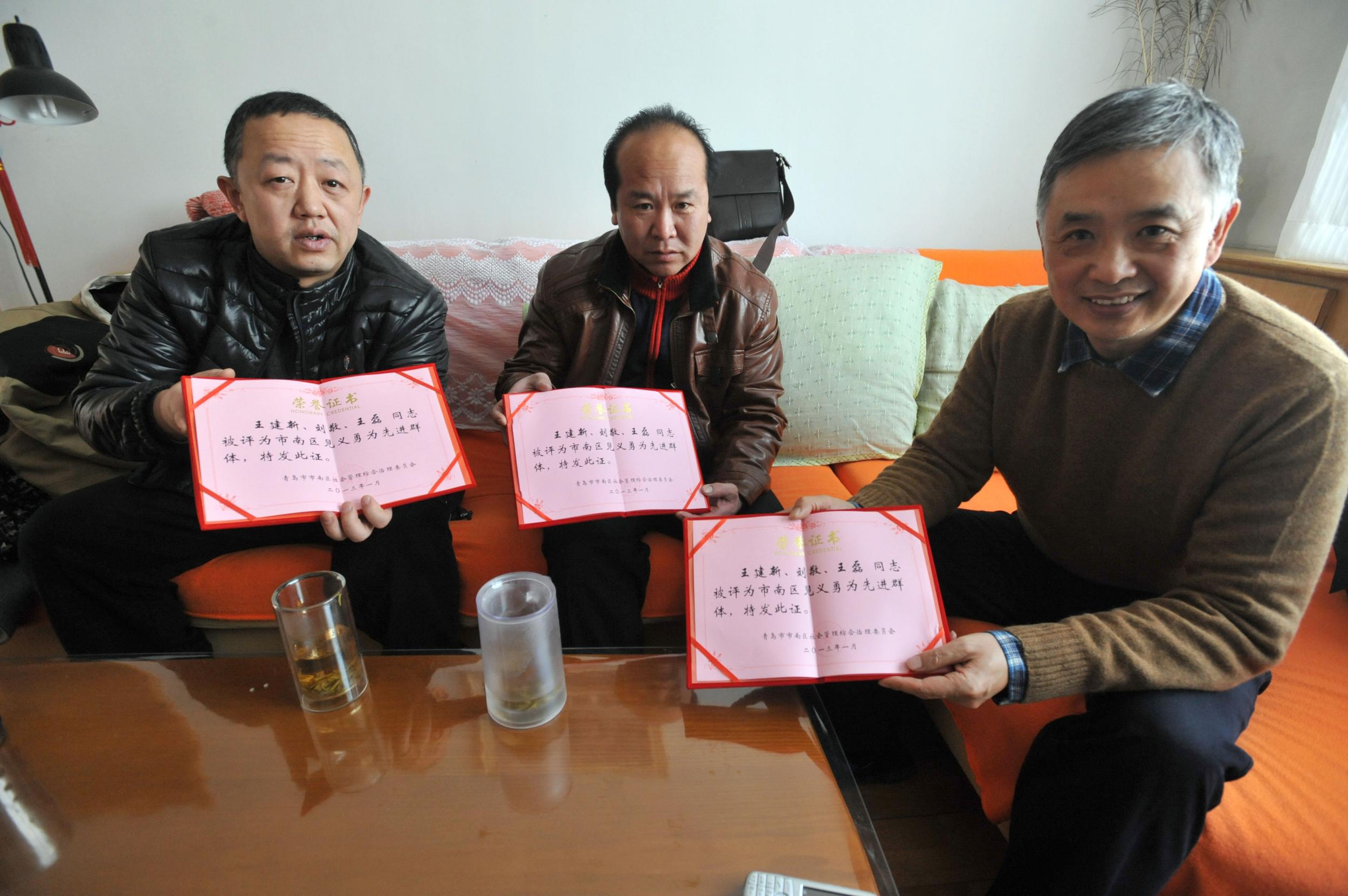 1月8日下午4点,寒风凛冽。音乐广场海域一名60岁左右的老人突然跳海轻生。市民王建新、王磊、刘敬见状毫不犹豫地入海营救,此时气温已达-10℃,王建新不假思索率先跳入冰凉刺骨的海中,62岁的退伍老兵刘敬闻声紧跟其后,低温冻僵了肌肉,游泳速度受到限制,他在海水里往返游了40多米咬牙支撑,47岁的王磊,来不及脱衣服就加入到救人的接力中。三人齐心将漂出20多米远的老人成功救上岸。上岸后王磊对落水者及时进行了拍背按压施救,10分钟后,老人终于恢复了呼吸。当时所有在场的市民都发出了欢呼声。勇士们的壮举绝非偶然,王建新一个月前,还曾在海边和市民一起用杆子救过一名落水市民,并且已经连续16年给希望工程捐款,最先受资助的女孩现已读完大学走上工作岗位。在有人慨叹人心不古,质疑社会冷漠的时候,三位勇士临危挺身,给出了响亮的答案。