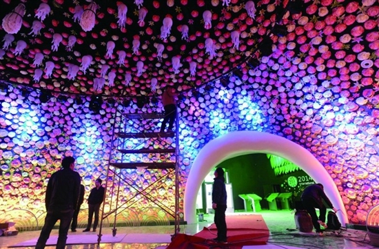大厅的天花板则融入了海洋元素,海星、贝壳还有悬挂在空中的海豚带来了一股大海的清新味道。大厅内,负责装修的工作人员正搬着梯子忙活着最后的收尾工作。穿过两片大贝壳搭成的圆形拱门,视野忽然暗了下来,屋顶上海鸥、海豚正在“嬉戏”,“这些都是用玻璃丝制成的。”中建八局四公司主题馆项目部安装负责人王建军告诉记者,这间展房将主要展示岛城的海边文化。记者看到,展房地面中间铺着几块透明的玻璃,在玻璃下面的屏幕正映着电脑投影。沿着扶梯走上二楼,是中华文化的主题展示区域,从发明地动仪的张衡、儒家文化鼻祖孔子等历史文化名人,到泰山石、蓬莱仙岛等著名景点造型雕塑都将会在这里展示。记者留意到,在主题馆内,环形影院的施工也接近尾声,工作人员正在对环形影院内的声电系统和自动步道进行最后调试,4月1日就能全面竣工。