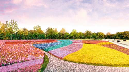 “七彩飘带”展区按照色彩变化,被划分成了赤、橙、黄、绿、青、蓝、紫七个片区,设计上对应着中国传统文化中的“日、月、金、木、水、火、土”。为了在184天的展期当中,世园会的52000平米的花卉全部盛开,始终保持时令花卉的盛开,展现世园会花的色彩。
