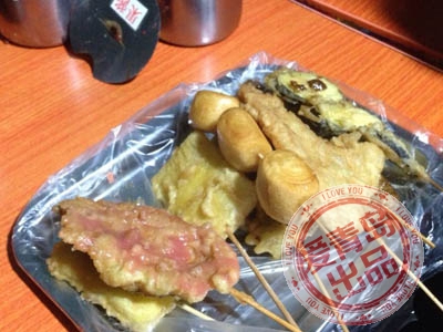推荐:传统项目基本都有,另外大部分都是各种关东煮类的东西,就是跟甜不辣一个性质的产品,李姐推荐了她家的几种招牌,大鸡排和五花肉,这两种都是裹面包屑炸的;据说有9种口味的酱,大鸡排上撒的辣椒面巨辣无比。