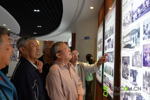 在各届毕业照展示栏前,几位65届毕业的老校友围在一起,笑容满面的指着照片上的自己和老同学。