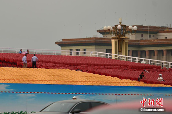 近日,为迎接将于9月3日举行的“纪念中国人民抗日战争胜利七十周年”阅兵活动,天安门广场搭建起的临时观礼台已逐渐露出“真容”。广场中心花坛以“长城”为主题,位于英雄纪念碑的北侧,分东西各一组,单组东西长60米,南北宽25米。据悉,这是继2008年奥运会后,天安门广场再次使用植物花卉,搭建自然山水花坛。花坛以雄伟巍峨的长城为主景,配以挺拔的造型油松,通过丰富多彩的植物花卉及白鸽、年号、景石等素材,搭建出祖国的壮丽山水画卷美景。