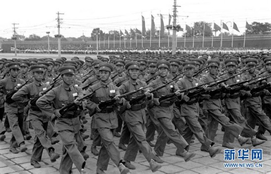 这是1954年国庆阅兵式上,步兵在军乐声中列队经过天安门检阅台接受检阅。