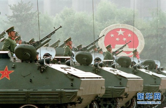 这是1984年国庆阅兵式上,装甲运兵车方阵通过天安门广场。