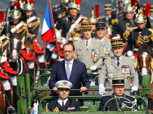 2015年7月14日,法国举行了传统的国庆阅兵典礼,法国总统奥朗德在巴黎协和广场检阅军队。今年的阅兵式特别向参与反恐行动的军警致敬,法国从事反恐行动的三支特种突击部队首次参加阅兵。