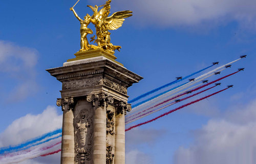 “法兰西巡逻兵”飞行表演队队员驾驶的12架飞机在巴黎上空拉出法国国旗红白蓝三色彩烟,揭开了阅兵式序幕。12架飞机在巴黎上空排成洛林十字架队形,在检阅台上空呼啸而过。洛林十字架是戴高乐将军领导的抵抗纳粹的自由法国运动标志。