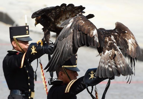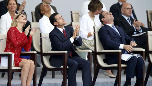 正在法国进行国事访问的墨西哥总统培尼亚·涅托作为嘉宾在主席台与奥朗德并排就坐。约150名墨西哥军人也应邀首次参加了法国国庆阅兵式,并在阅兵式上走在最前面。墨西哥队伍中有6名军人携带6只老鹰,展示墨西哥国家的象征。