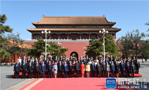 9月3日,纪念中国人民抗日战争暨世界反法西斯战争胜利70周年大会在北京天安门广场隆重举行。纪念大会开始前,中共中央总书记、国家主席、中央军委主席习近平和夫人彭丽媛在端门外广场迎接出席大会的外方代表团团长及其配偶,并同他们合影留念。