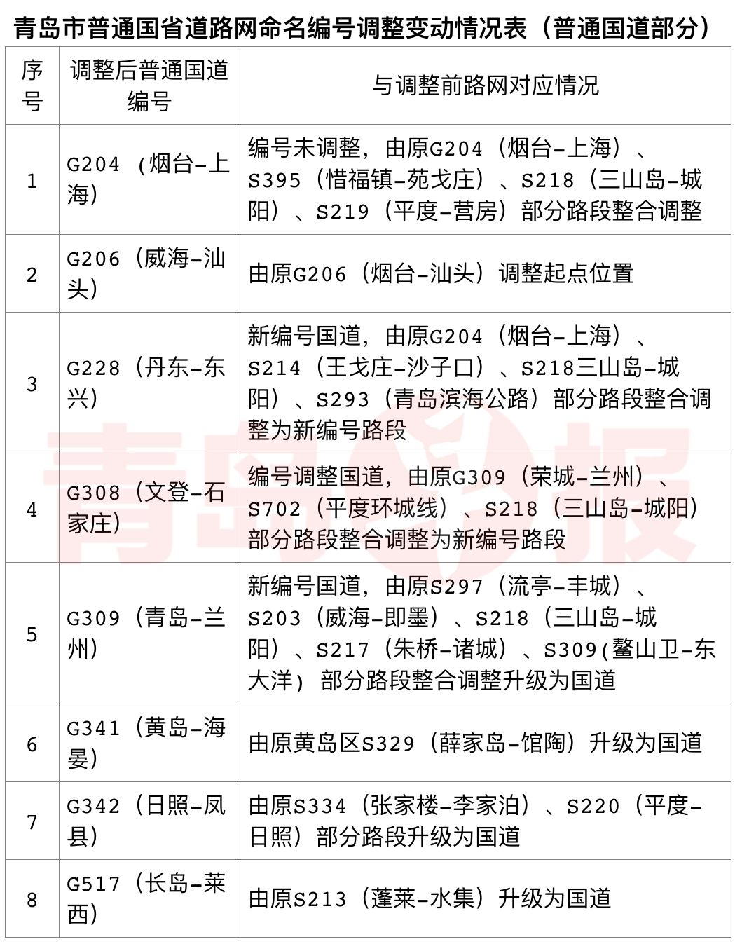普通国道由3条调整为8条,分别为G204烟沪线(烟台-上海)、G206威汕线(威海-汕头)、G228丹东线(丹东-东兴)、G308文石线(文登-石家庄)、G309青兰线(青岛-兰州)、G341黄海线(黄岛-海晏)、G342日凤线(日照-凤县)、G517长莱线(长岛-莱西)。