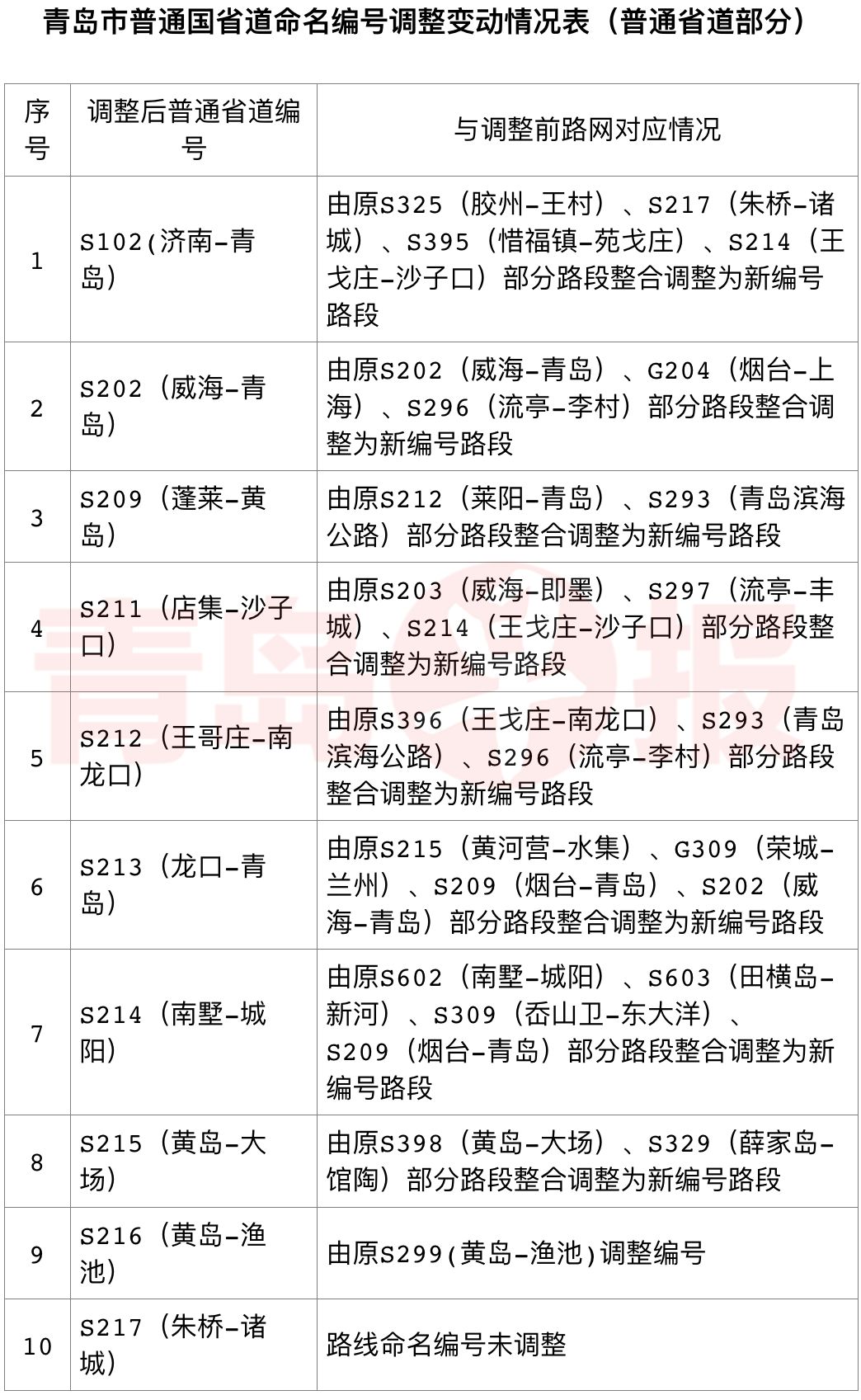 S102济青线(济南-青岛)、S202威青线(威海-青岛)、S209蓬黄线(蓬莱-黄岛)、S211店沙线(店集-沙子口)、S212王南线(王哥庄-南龙口)、S213龙青线(龙口-青岛)、S214南城线(南墅-城阳)、S215黄大线(黄岛-大场)、S216黄渔线(黄岛-渔池)、S217朱诸线(朱桥-诸城)、S218三城线(三山岛-城阳)、S219灰里线(灰埠-里岔)、S220平日线(平度-日照)、S307小莱线(小纪-莱州)、S309田高线(田横-高青)、S310躬崔线(躬家庄-崔家集)、S311黄张线(黄岛-张家屯)、S312张海线(张家楼-海清)、S502南武线(南墅-武备)、S503岙东线(岙山卫-东大洋)、S504(薛家岛环岛路)