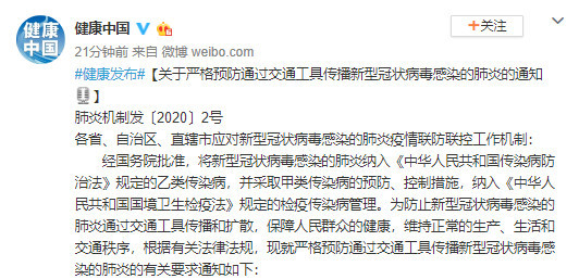 经国务院批准,将新型冠状病毒感染的肺炎纳入《中华人民共和国传染病防治法》规定的乙类传染病,并采取甲类传染病的预防、控制措施,纳入《中华人民共和国国境卫生检疫法》规定的检疫传染病管理。为防止新型冠状病毒感染的肺炎通过交通工具传播和扩散,保障人民群众的健康,维持正常的生产、生活和交通秩序,根据有关法律法规,现就严格预防通过交通工具传播新型冠状病毒感染的肺炎的有关要求通知如下: