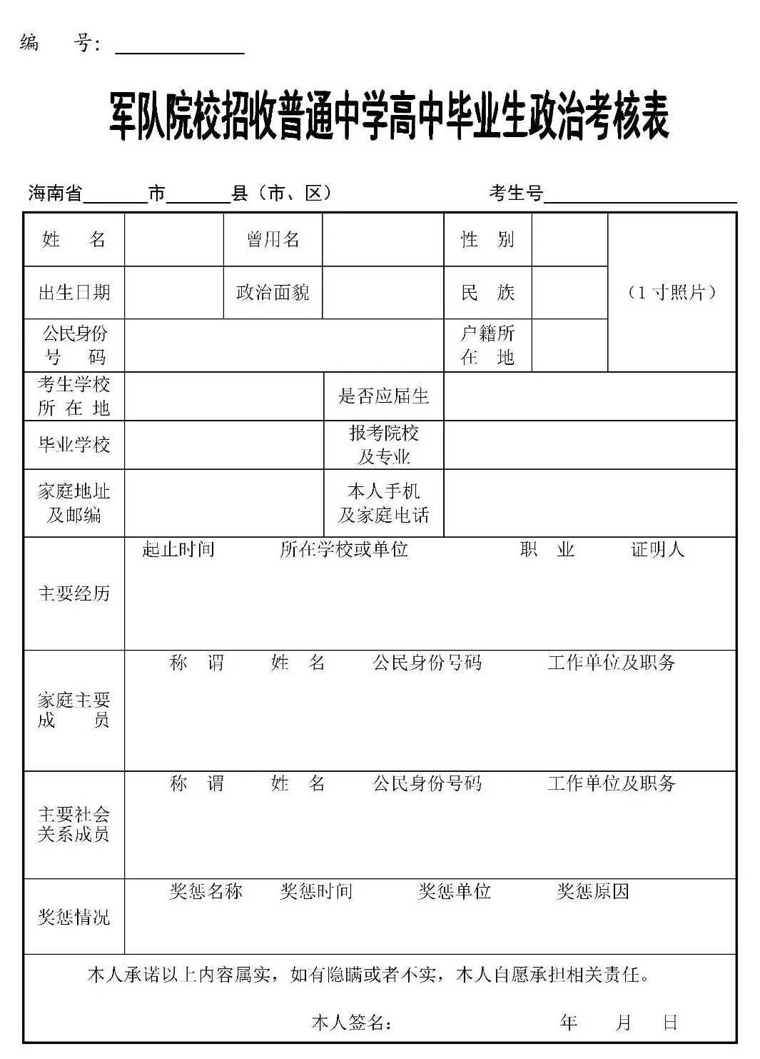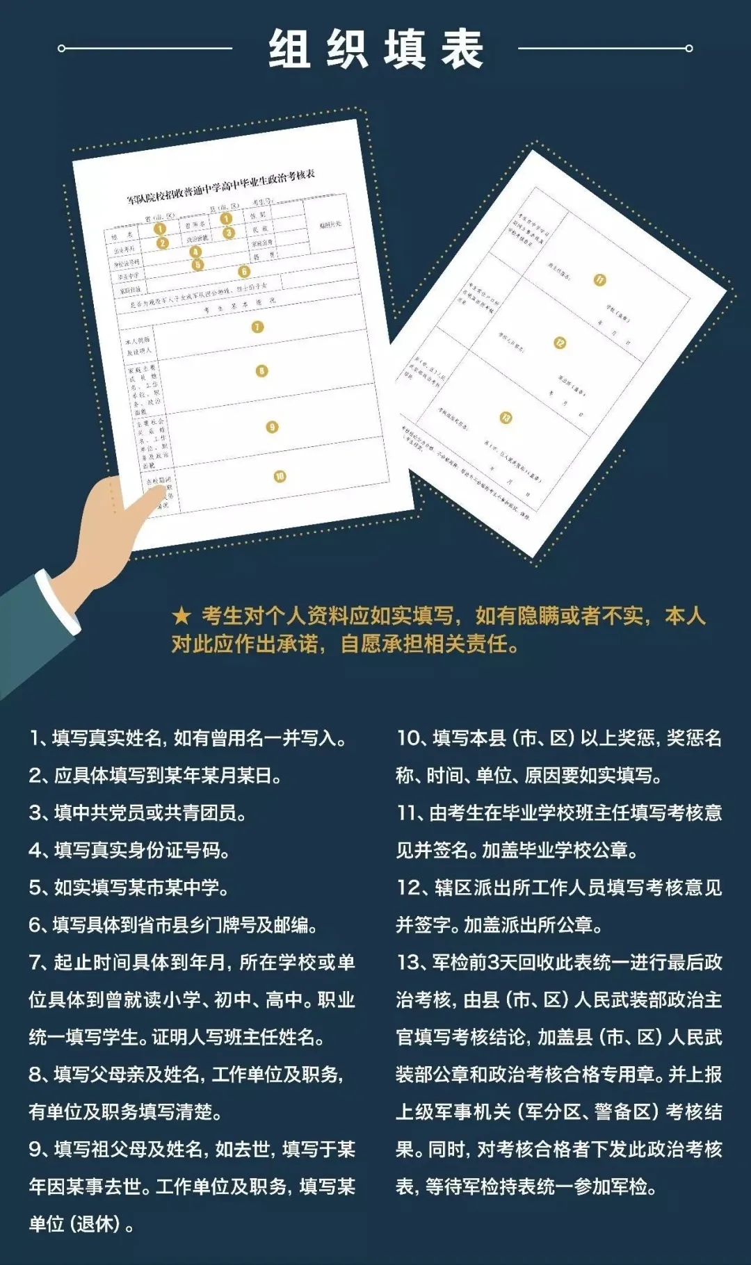 1、高考结束后,符合政治考核基本条件的考生可到报考所在地人武部领取,或登录招生考试信息网站下载《军队院校招生普通中学高中毕业生政治考核表》(以下简称《政治考核表》),正反面打印,考生填写个人信息。