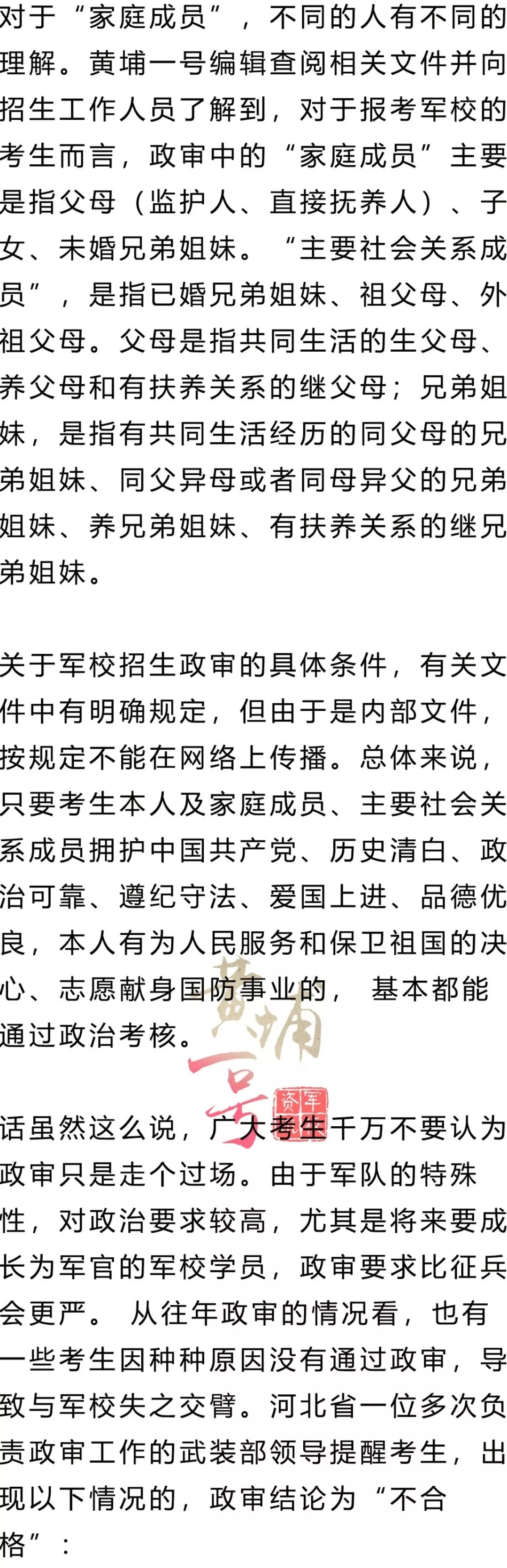 报考军校的高中毕业生考生,除了高考成绩要达到录取分数线,还要参加各省军区招生办公室组织的政审、面试和体检。政审(全称为政治考核)作为其中一道关口,如果不过关,即使别的条件达到,也无法被录取。