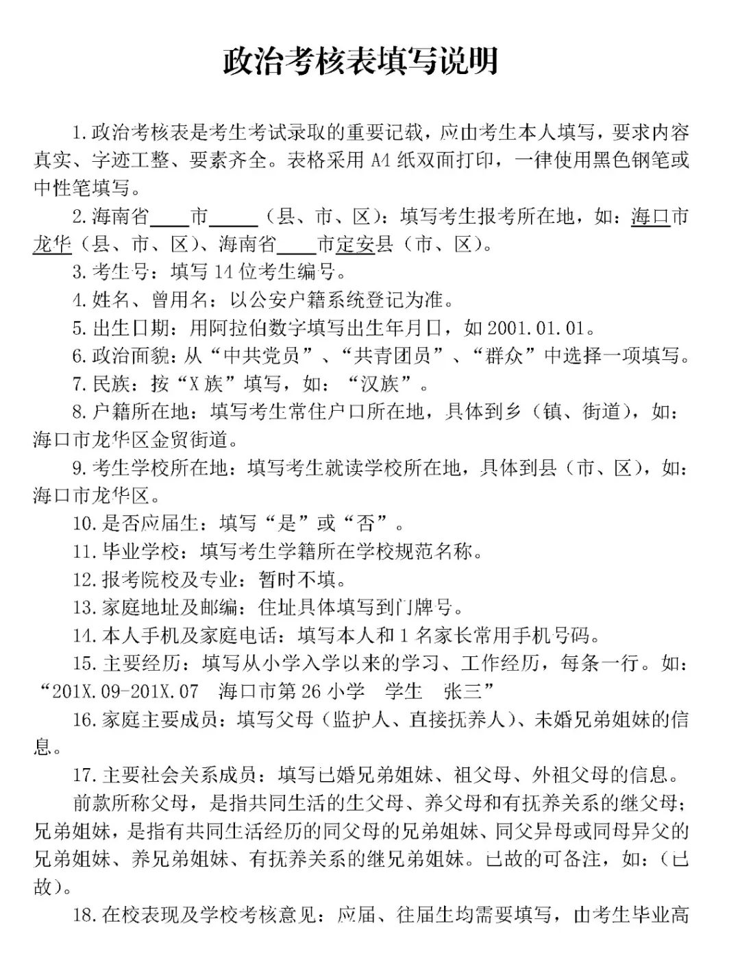 1.政治考核表是考生考试录取的重要记载,应由考生本人填写,一律使用黑色钢笔或中性笔填写,要求内容真实、字迹工整、要项齐全。表格采用A4纸双面打印。