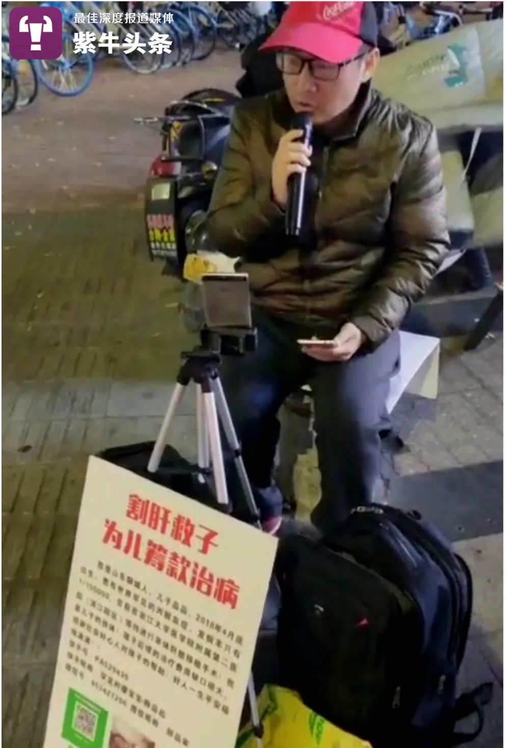 他穿着朴素,身旁放着一个行李箱,面前放着一张纸板,上面有他与儿子的照片,还有他“割肝救子”为儿筹款治病的感人故事。