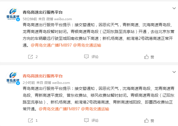 11月4日,记者从青岛高速出行服务平台了解到:接交警通知,因恶劣天气,青新高速即墨段、平度段、沈海高速青岛段暂时封闭。青银高速青岛段(辽阳东路至流亭站)开通,去往北京东营方向的车辆最远行驶至即墨西收费站下高速;青新高速城阳段、龙青高速青岛段、新机场高速、前湾港2号疏港高速正常开通。