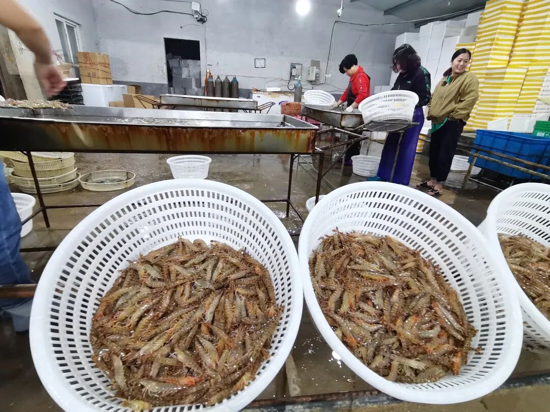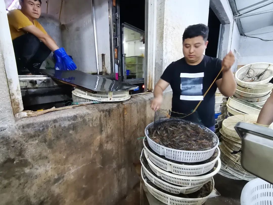 随着几辆冷链海鲜车驶入小院,10多名工作人员开始忙着从车上卸货。一筐筐鲜活的竹节虾,在这里完成分拣交易。