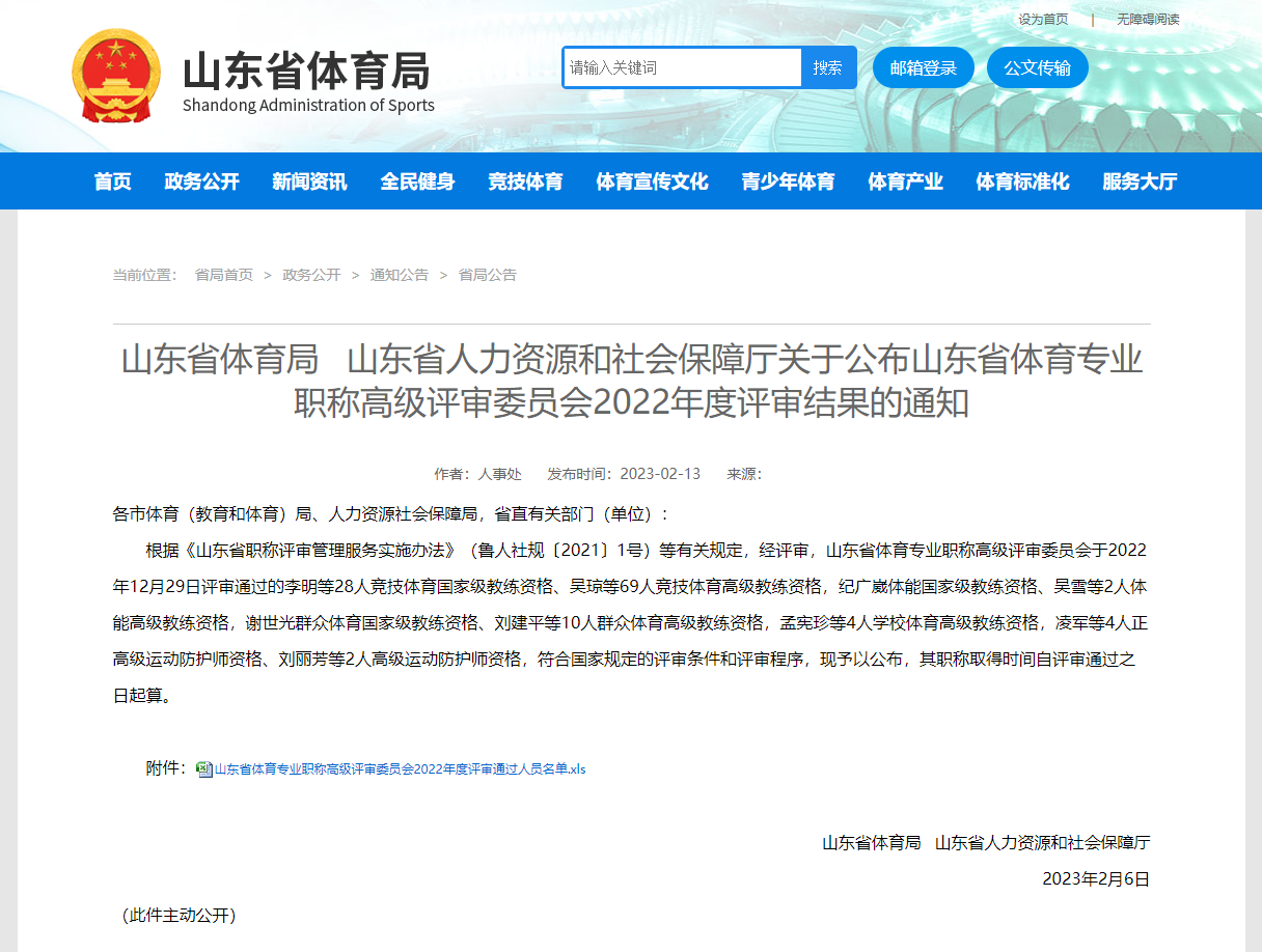山东省体育专业职称高级评审委员会2022年度评审通过人员名单。(部分截图)