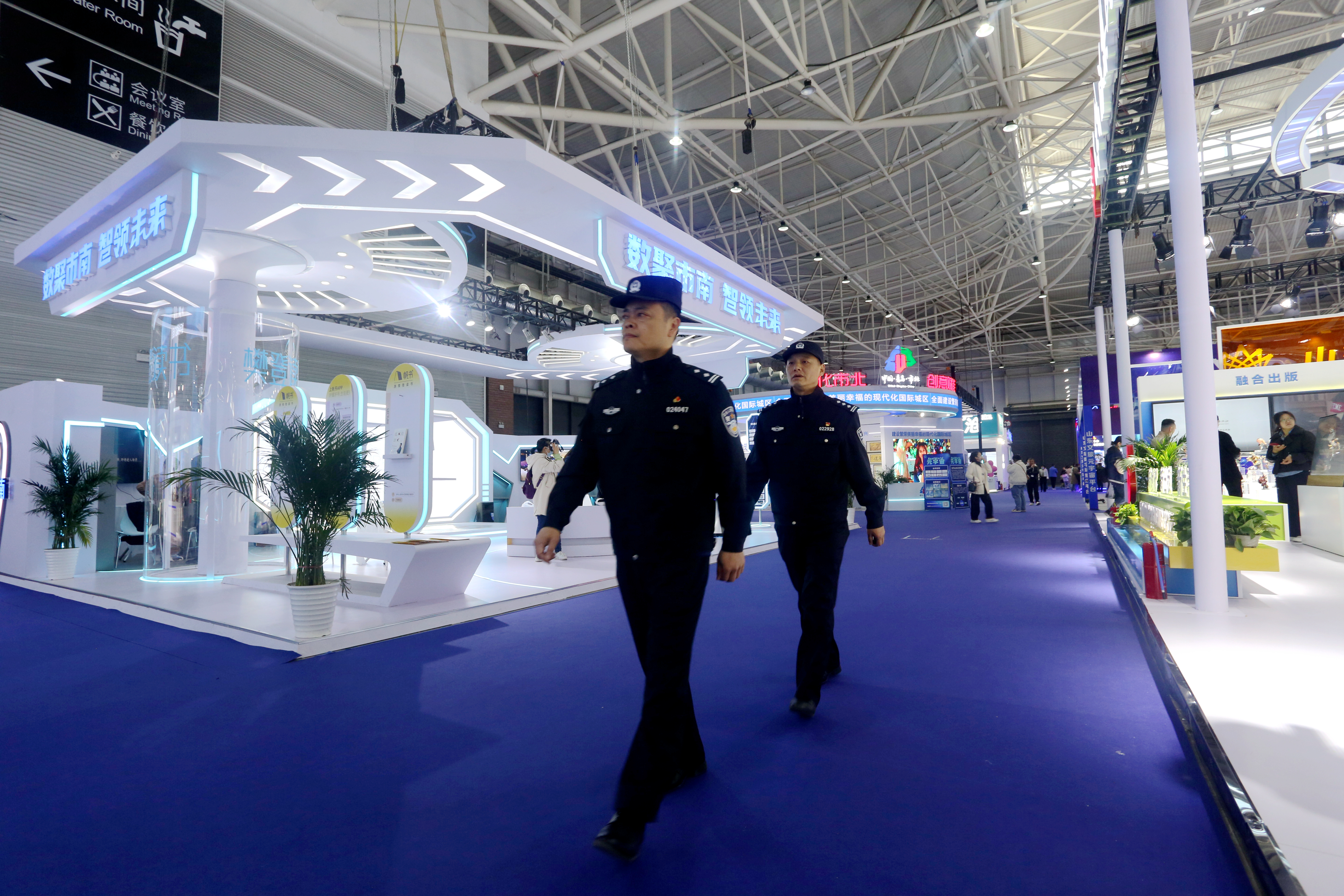 在展馆内,执勤民警精神饱满,身姿挺拔,他们有的在出入口维持秩序,有的在参展人流中巡逻,接到群众的求助,他们立即处理,确保展览活动秩序井然。