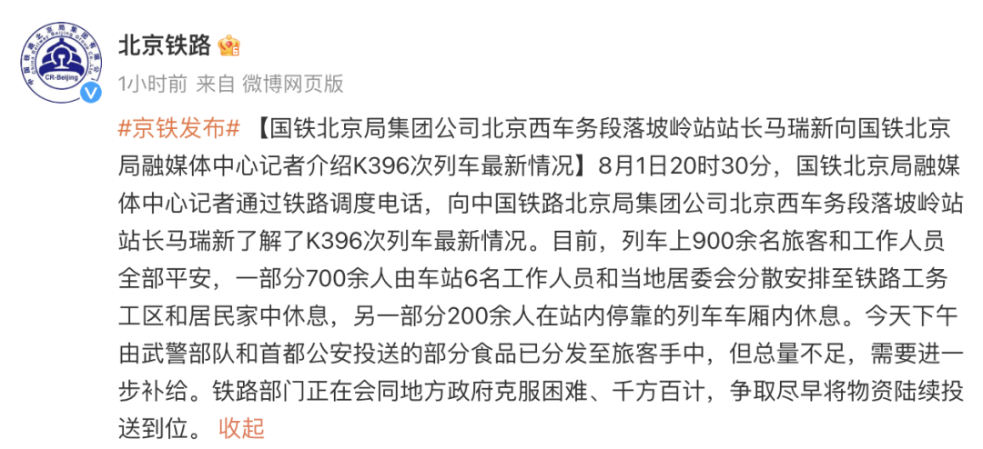 8月1日20时30分,国铁北京局融媒体中心记者通过铁路调度电话,向中国铁路北京局集团公司北京西车务段落坡岭站站长马瑞新了解了K396次列车最新情况。目前,列车上900余名旅客和工作人员全部平安,一部分700余人由车站6名工作人员和当地居委会分散安排至铁路工务工区和居民家中休息,另一部分200余人在站内停靠的列车车厢内休息。今天下午由武警部队和首都公安投送的部分食品已分发至旅客手中,但总量不足,需要进一步补给。铁路部门正在会同地方政府克服困难、千方百计,争取尽早将物资陆续投送到位。