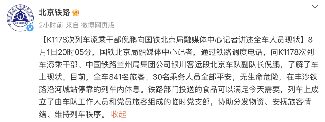 8月1日20时05分,国铁北京局融媒体中心记者,通过铁路调度电话,向K1178次列车添乘干部、中国铁路兰州局集团公司银川客运段北京车队副队长倪鹏,了解了车上现状。目前,全车841名旅客、30名乘务人员全部平安,无生命危险,在丰沙铁路沿河城站停靠的列车内休息。铁路部门投送的食品可以满足今天需要,列车上成立了由车队工作人员和党员旅客组成的临时党支部,协助分发物资、安抚旅客情绪、维持列车秩序。