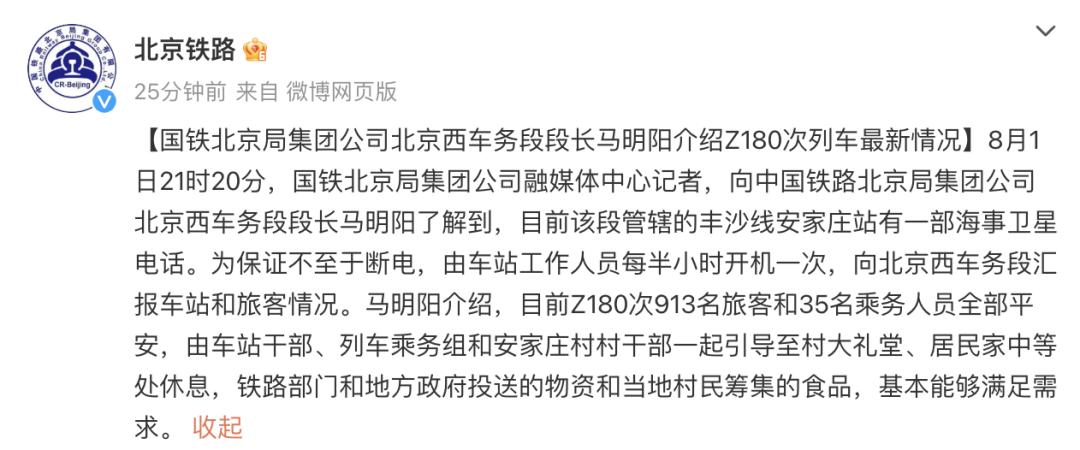 8月1日21时20分,国铁北京局集团公司融媒体中心记者,向中国铁路北京局集团公司北京西车务段段长马明阳了解到,目前该段管辖的丰沙线安家庄站有一部海事卫星电话。为保证不至于断电,由车站工作人员每半小时开机一次,向北京西车务段汇报车站和旅客情况。马明阳介绍,目前Z180次913名旅客和35名乘务人员全部平安,由车站干部、列车乘务组和安家庄村村干部一起引导至村大礼堂、居民家中等处休息,铁路部门和地方政府投送的物资和当地村民筹集的食品,基本能够满足需求。