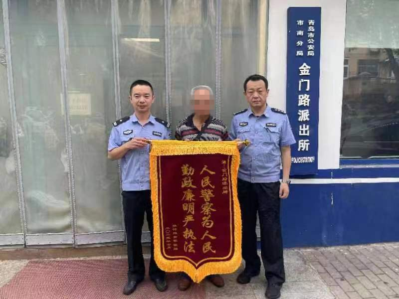 7月29日,市南公安分局金门路派出所辖区居民张先生将一面印有“人民警察为人民,勤政廉明严执法”的锦旗送到了金门路派出所民警的手中,感谢办案人员为其追回被骗的7万元钱。