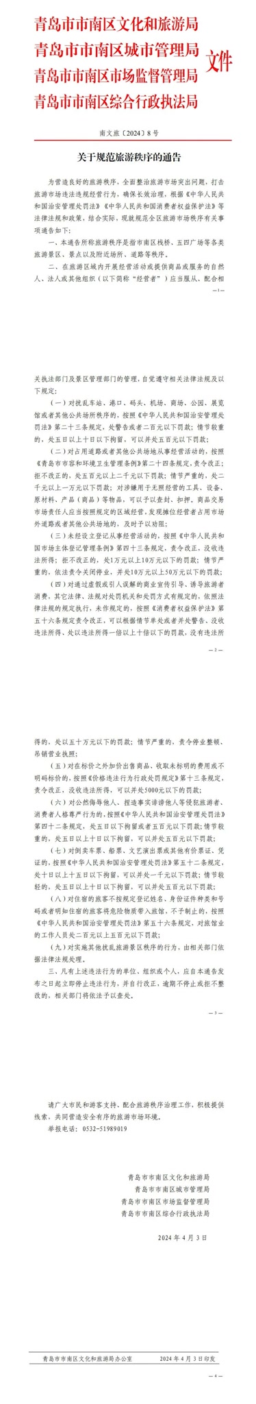 一、本通告所称旅游秩序是指市南区栈桥、五四广场等各类旅游景区、景点以及附近场所、道路等秩序。