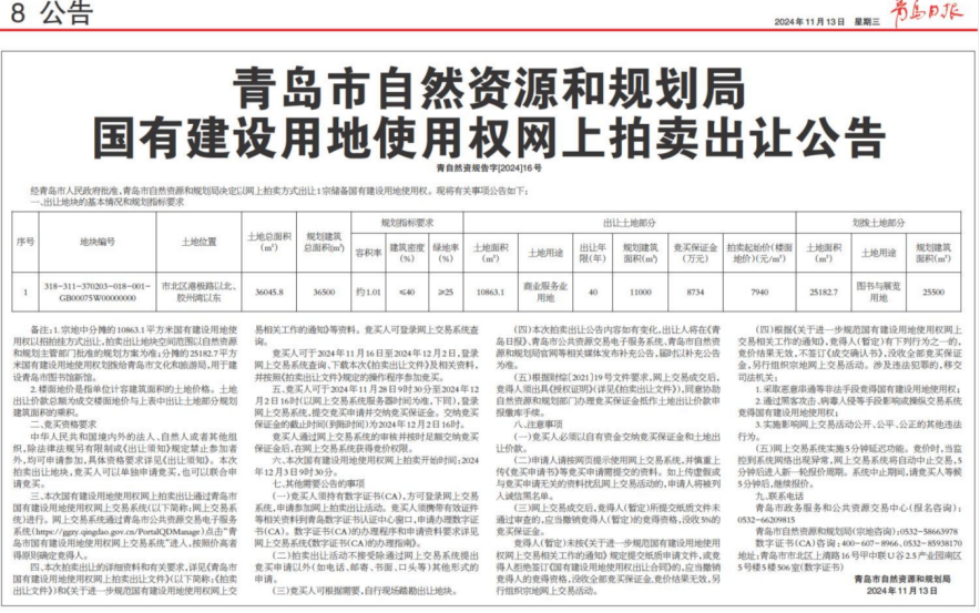 2024年11月13日,青岛国际邮轮港区启动区SF0102-055地块发布招拍挂公告。