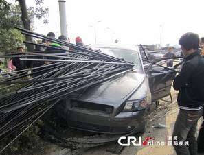浙江一轿车被上百钢筋扎透 驾驶员死里逃生