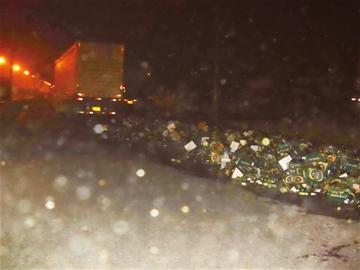 司机躲车急转弯 开平路上万瓶啤酒流成河