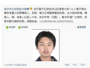 武汉警方公布建行爆炸案犯罪嫌疑人照片