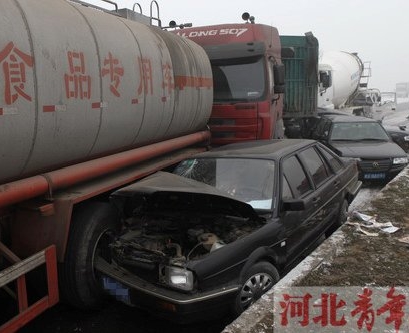 雾大路滑 石家庄一路口12辆车连环追尾