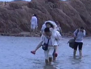 新人登上礁石拍婚纱 涨潮被困淡定等退潮