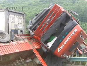 三辆大货车连环追尾 大货车头悬空