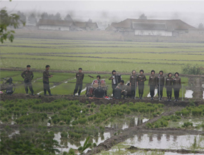 朝鲜歌唱队田间唱歌助阵农民插秧