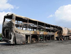 陕西客车追尾致36死3伤 车体烧成空壳