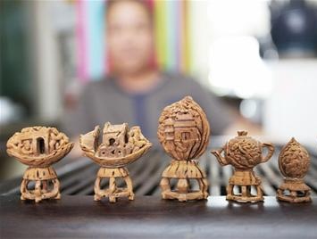 青岛民间艺人用桃核作画 每件需刻千余刀