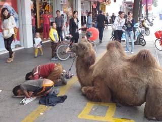 绍兴闹市区 两个孩子牵头骆驼乞讨