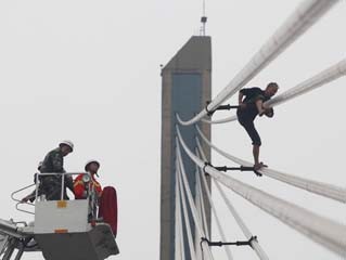 武汉男子爬上长江二桥斜拉锁欲跳桥