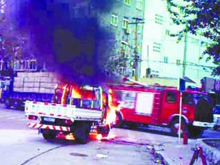 货车自燃驾驶室成空壳 油罐车司机看热闹