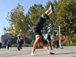 石家庄牛人倒立“跑” 百米90多秒
