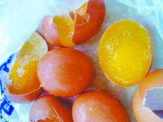 洛阳街头摊贩卖假鸡蛋 像皮筋嚼不烂