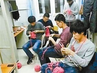 男寝集体织毛衣 给贫困山区孩子献爱心