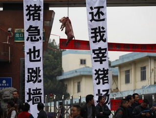 深圳肉联厂职工挂死猪维权 称猪急也跳墙