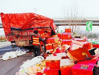 货车青银高速上爆胎 1500箱果粒橙撒一地
