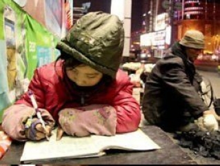 9岁女孩寒夜街头卖爆米花 借路灯做功课