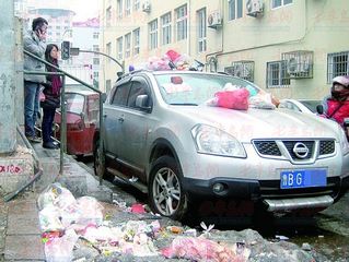 阳明路无良车堵住楼梯口 居民扔垃圾泄愤